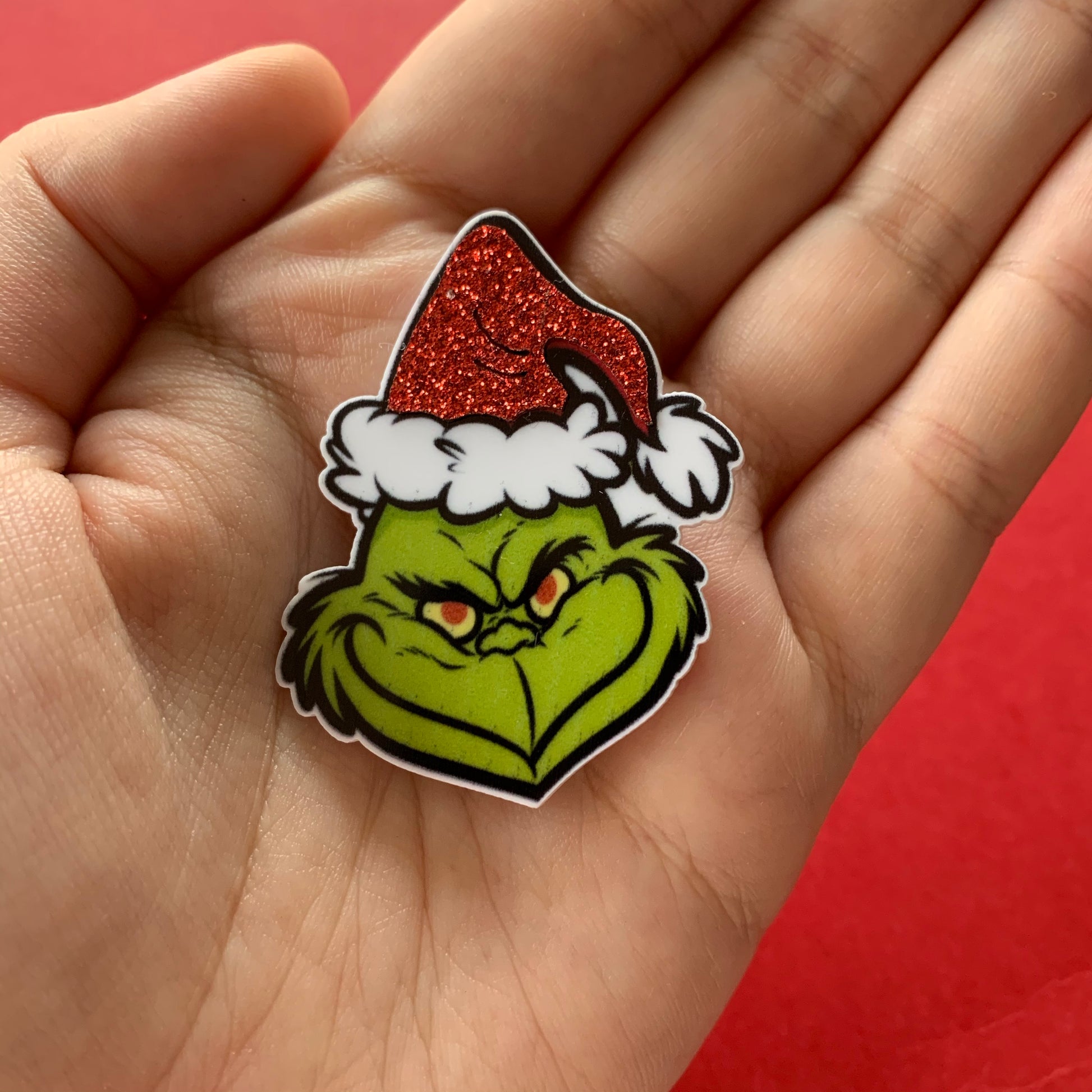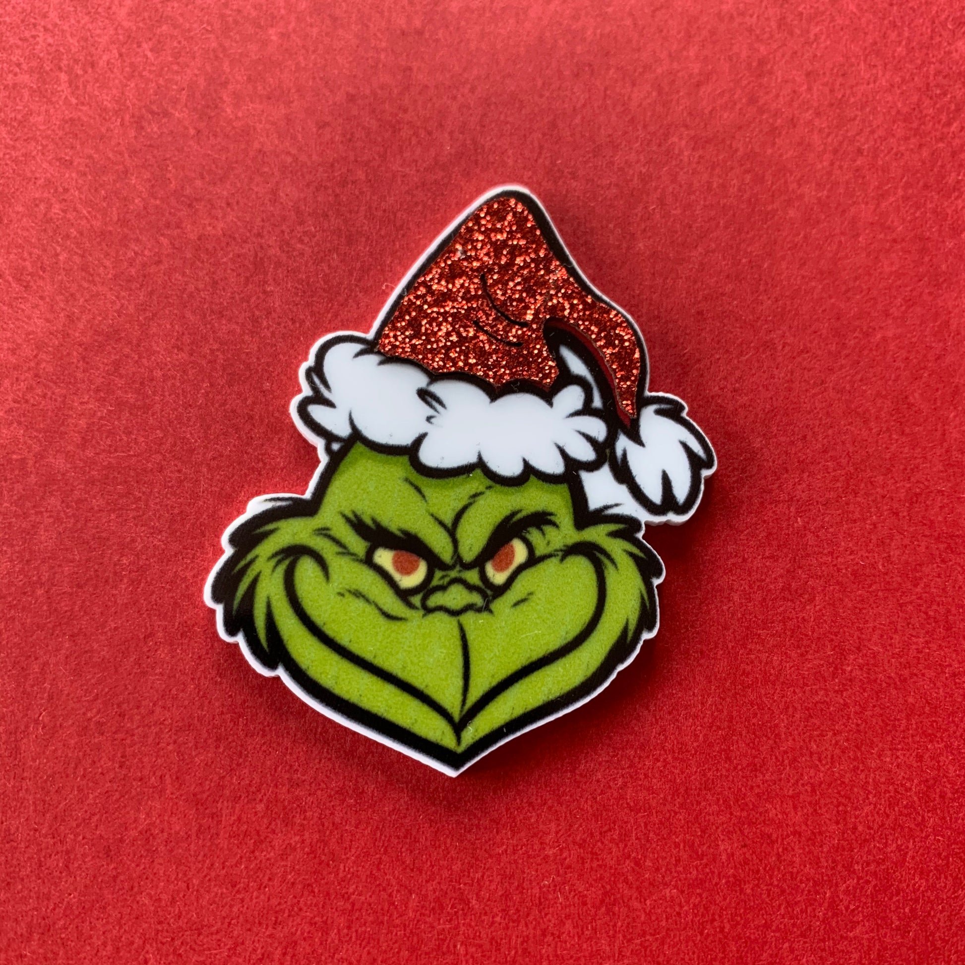 Grinch flat back acrylic with 3D glitter effect.